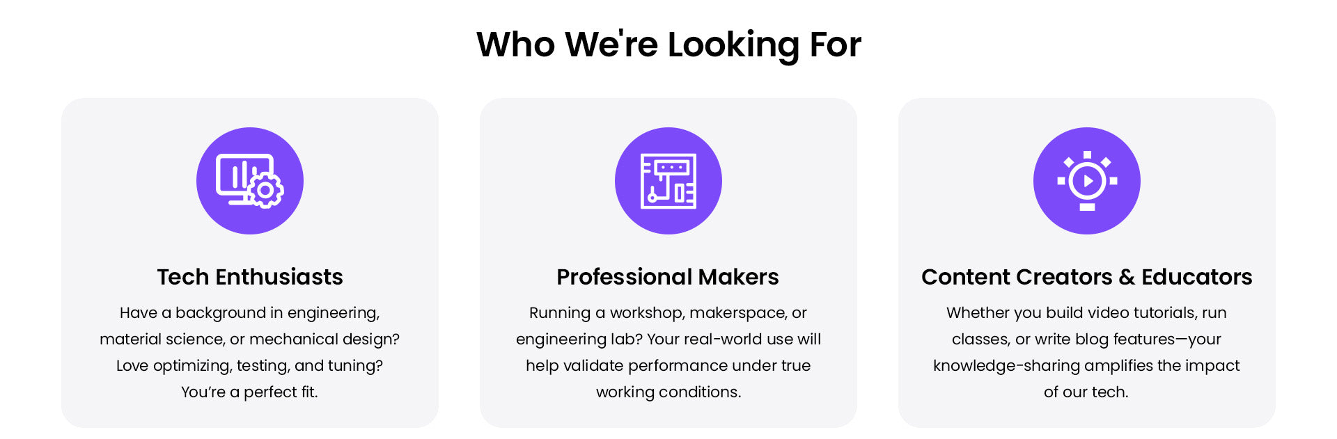 Tell us about your background, workshop setup, and your biggest 3D printing challenges. This form helps us better understand your printing experience. It includes 10 questions, with the last one asking you to upload photos or videos of your workshop. Taking some pictures or recording a short video in advance will make the process faster and easier.